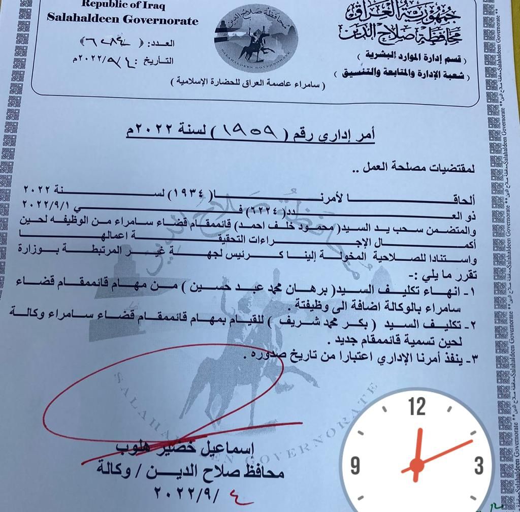 وجاء في امر اداري أنه “إلحاقاً لأمرنا (1934 ) لسنة 2022 ذو العدد 6624 في 1 / 9 / 2022 والمتضمن سحب يد (محمود خلف احمـد) قائممقام قضاء سامراء مـن الوظيفة لحين إكمال الإجراءات التحقيقية أعمالها واستنادا للصــلاحية المخولـة إلينـا كرئيس لجهة غير المرتبطة بوزارة تقرر إنهاء تكليف (برهان محمد عبـد حسين) مـن مـهــام قائممقام قضاء سامراء بالوكالة اضافة الى وظيفته وتكليف ( بكر محمد شريف ) للقيـام بـمـهــام قائممقـام قضـاء ســامراء وكالــة لحين تسمية قائممقام جديد”.