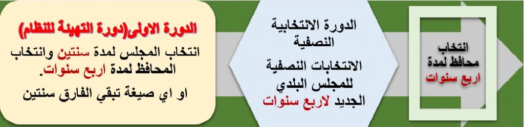 وهذا ما يمكن وضعه في آلية الانتخابات النصفية ابتداء من دورة أولى انتخابية أما أن تكون انتخاب للمحافظ لمدة ستة سنوات وانتخاب المجلس لمدة أربع سنوات، على تكون الانتخابات الأخرى في الدورة اللاحقة مصححة للفترة الزمنية حيث سينتخب مجلس المحافظة ويبقى المحافظ، ثم ينتخب المحافظ مع بقاء المجلس المنتخب نصفيا بما يشبه الانتخابات الأمريكية وهذا يتيح تنافس للأحزاب في حسن الأداء وكسب الثقة من خلال دعم محافظ أو نواب للمجلس المحلي.