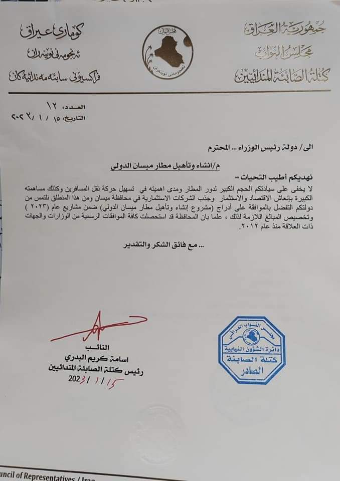 وثيقة: نائب يطالب رئاسة الوزراء بإدراج مشروع مطار ميسان الدولي ضمن مشاريع عام 2023