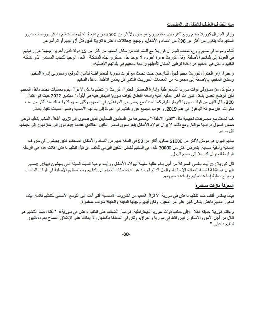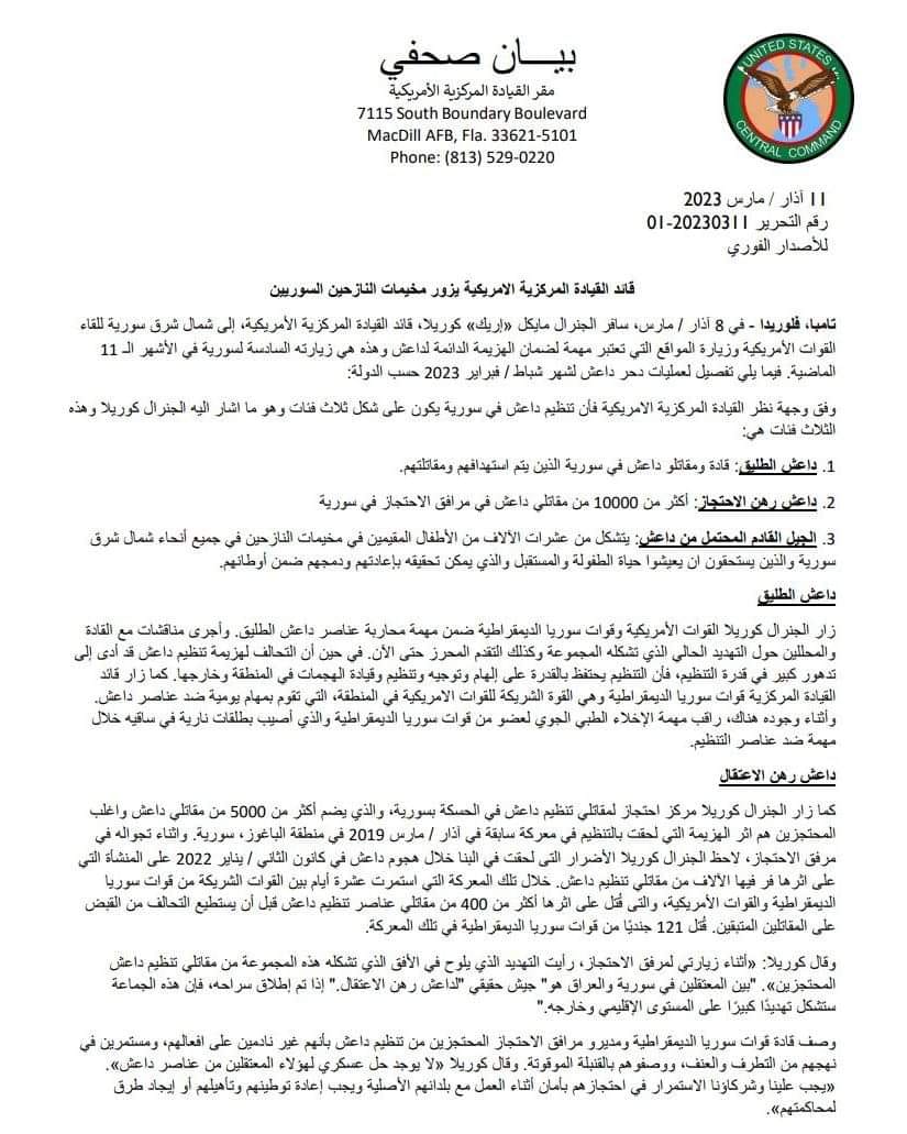 حذّرت القيادة المركزية الأميركية (سنتكوم)، من خطر الجيل القادم من تنظيم داعش والذي يتشكل في مخيمات شمال شرق سوريا، معتبراً إياه “جيشاً حقيقياً”. وقالت القيادة المركزية في بيان، يوم السبت (11 آذار 2023)، “تنظيم داعش في سوريا يكون على شكل ثلاث فئات: داعش الطليق، داعش رهن الاحتجاز، الجيل القادم المحتمل من داعش”. وكشفت وجود أكثر من 10 آلاف مقاتل لداعش في مراكز الاحتجاز في سوريا، محذرة من عشرات الآلاف من أطفال داعش المقيمين في مخيمات النازحين في شمال شرق سوريا. القيادة المركزية الأميركية، أكدت أن التحالف ألحق هزيمة بداعش أدت إلى تدهور كبير في قدرة التنظيم. من جانبه، قال قائد القيادة المركزية الأميركية لشمال شرق سوريا، الجنرال مايكل كوريلا، “أثناء زيارتي لمرفق الاحتجاز، لأيت التهديد يلوح في الأفق الذي تشكله هذه المجموعة من مقاتلي تنظيم داعش المحتجزين”، مردفاً أن هنالك “جيشاً حقيقياً لداعش رهن الاعتقال في سوريا والعراق”. كوريلا حذّر بالقول “إذا تم إطلاق سراحه، فإن هذه المجموعة ستشكل تهديداً كبيراً على المستوى الإقليمي وخارجه”. القيادة المركزية أكدت على أنها مستمرة إلى جانب قوات سوريا الديمقراطية، بالضغط على تنظيم داعش في سوريا.