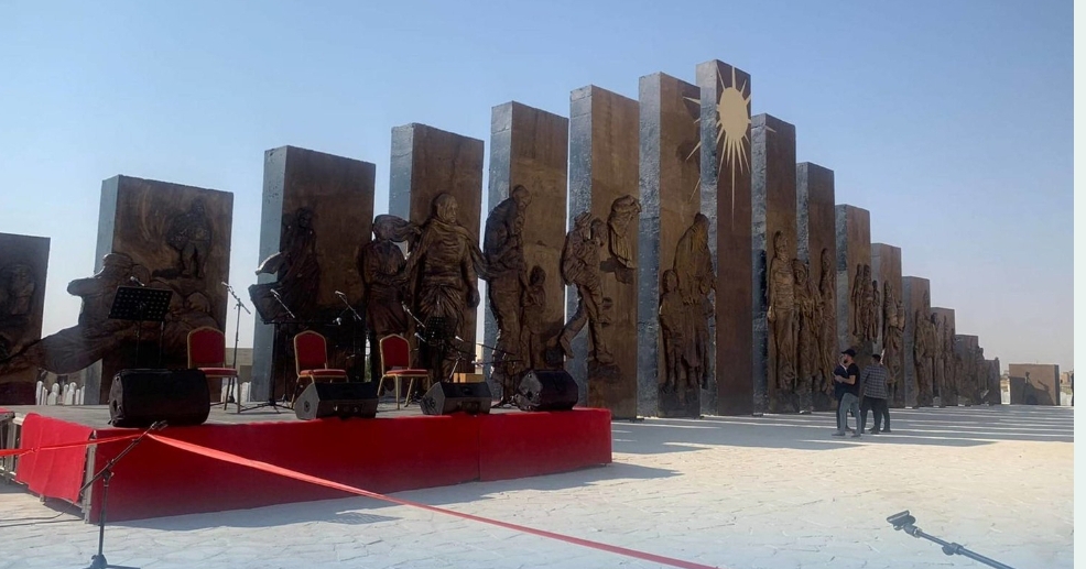 إزاحة الستار عن نصب تذكاري في قضاء سنجار الذي يُخلِّد جريمة الإبادة الجماعية التي تعرض لها الإيزيديون على يد تنظيم داعش بعد اجتياحه للقضاء في صيف العام 2014.
