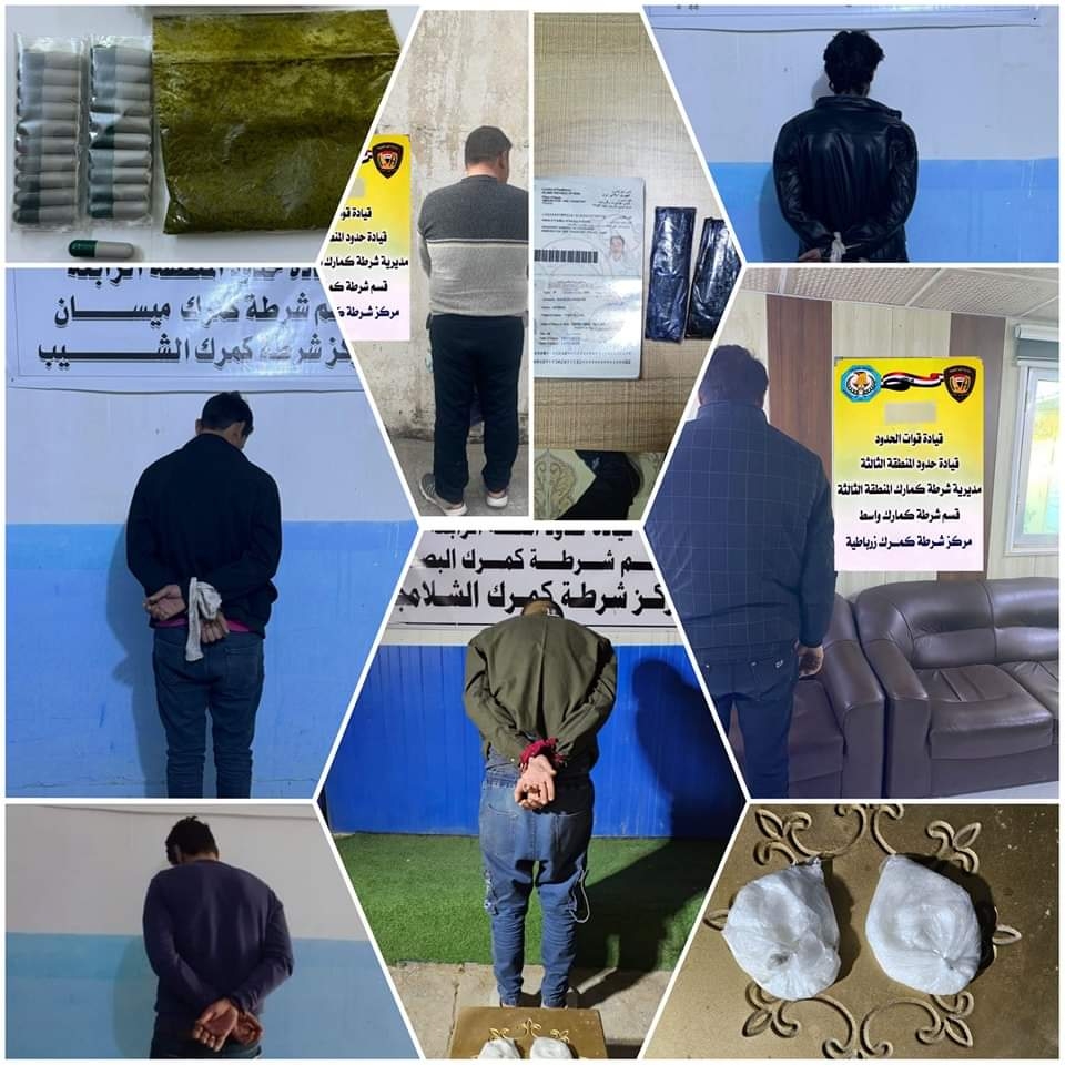 وقال بيان للقيادة، تلقته عراقيون ان “مفارز مديرية شرطة الكمارك في مراكز شرطة كمرك (الشلامجة والشيب والمنذرية وزرباطية)، تمكنت من ضبط (7) متهمين اجانب، ومتهم عراقي واحد، بحوزتهم مواد مخدرة نوع (حشيشة، وكرستال، وترياك، وترامادول“)