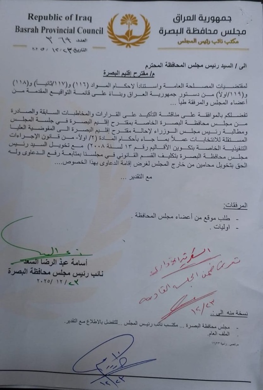 Posted in أهم الأخبار سياسـةرئيس مجلس محافظة البصرة يدرج مقترح الإقليم في جدول أعمال الجلسة المقبلةby iraq•24 ديسمبر، 2025 وجّه رئيس مجلس محافظة البصرة، خلف البدران، بحسب وثيقة حصلت عليها “بغداد اليوم”، اليوم الأربعاء (24 كانون الأول 2025)، بإدراج فقرة “مقترح إقليم البصرة” ضمن جدول أعمال الجلسة المقبلة للمجلس. أدناه نص الوثيقة: iraq More by iraq